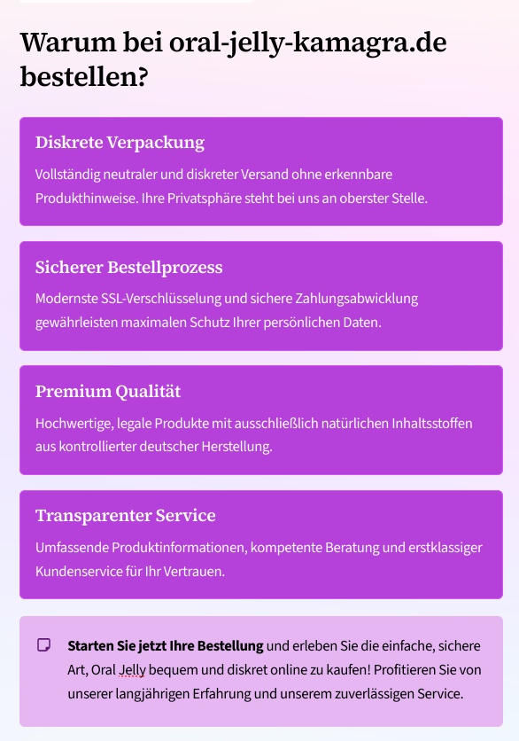 Entdecken Sie unseren einfachen und sicheren Bestellprozess für hochwertige Oral Jelly Produkte. Mit nur wenigen Klicks können Sie diskret und bequem von zu Hause aus bestellen. Unser Shop bietet Ihnen eine benutzerfreundliche Oberfläche, sichere Zahlungsmethoden und schnellen Versand aus Deutschland.